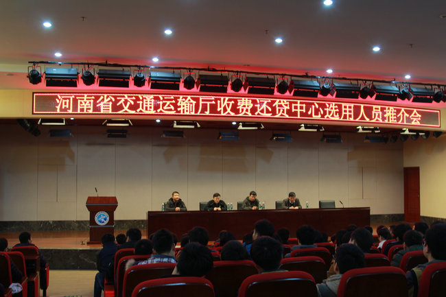 11月23日中午,河南交通运输厅收费还贷中心在新校区报告厅举办了实习人员推介会。学院工会主席张瑞春,招生就业处、学生工作处、院团委、各系(院)负责人及相关老师,2015年在校实习生240余人参加了会议。会议由学生工作处处长张震主持。