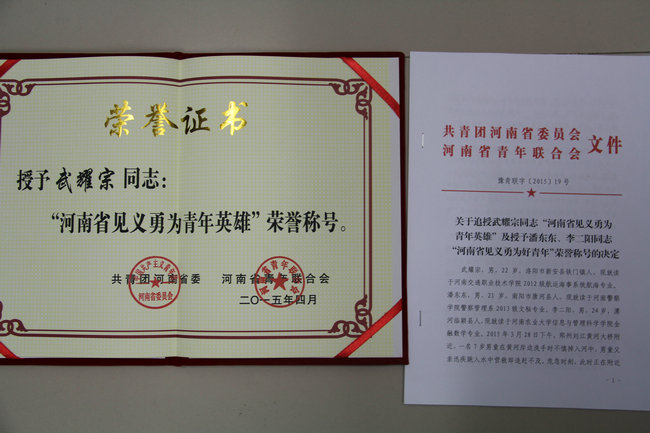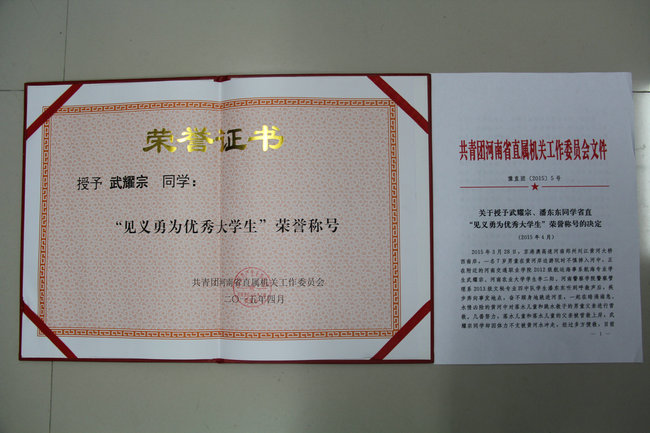 近日,共青团河南省委与共青团河南省直属机关工作委员会先后下发表彰决定(豫青联字[2015]19号,豫直团[2015]5号)授予我院武耀宗同学“河南省见义勇为青年英雄”、“见义勇为优秀大学生”荣誉称号。