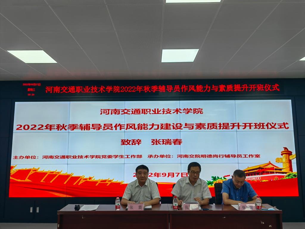 9月7日至8日,由学生工作部主办,河南交院明德尚行辅导员工作室承办的2022年秋季辅导员作风能力建设和素质提升培训班在郑东校区举行。副校长张瑞春出席开班仪式、近两年新入职专职辅导员参加开班仪式,培训由学生工作处处长张震主持。