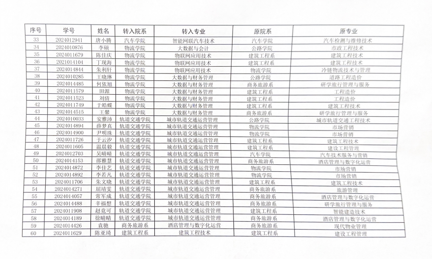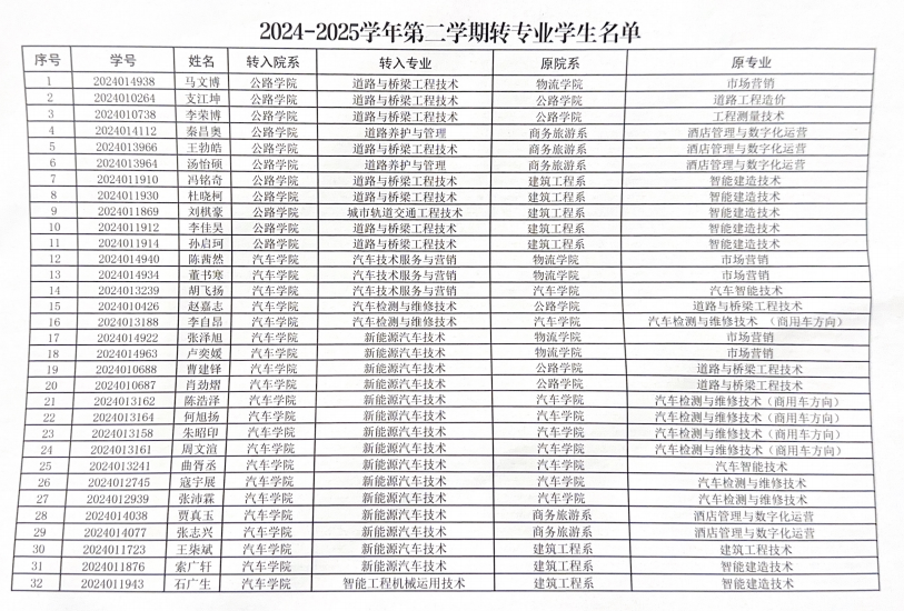 为满足广大学生需求,进一步提高学生学习的积极性、主动性和创造性,根据《河南交通职业技术学院学生转专业转学管理办法(修订)》(豫交院[2024]142号)文件要求,经学生本人申请、院(系)考核、学生工作处复核,校长授权的专题会议研究,决定批准马文博等60名同学的转专业申请,现将名单予以公示(见附件)。